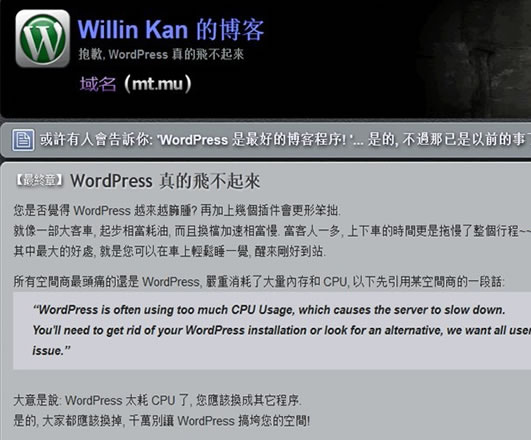 WordPress无疑以成为众多服务器杀手中的大户,曾经玩WordPress的大师高手Willin Kan 童鞋在放弃经营多年的博客和文章后是这样说的: